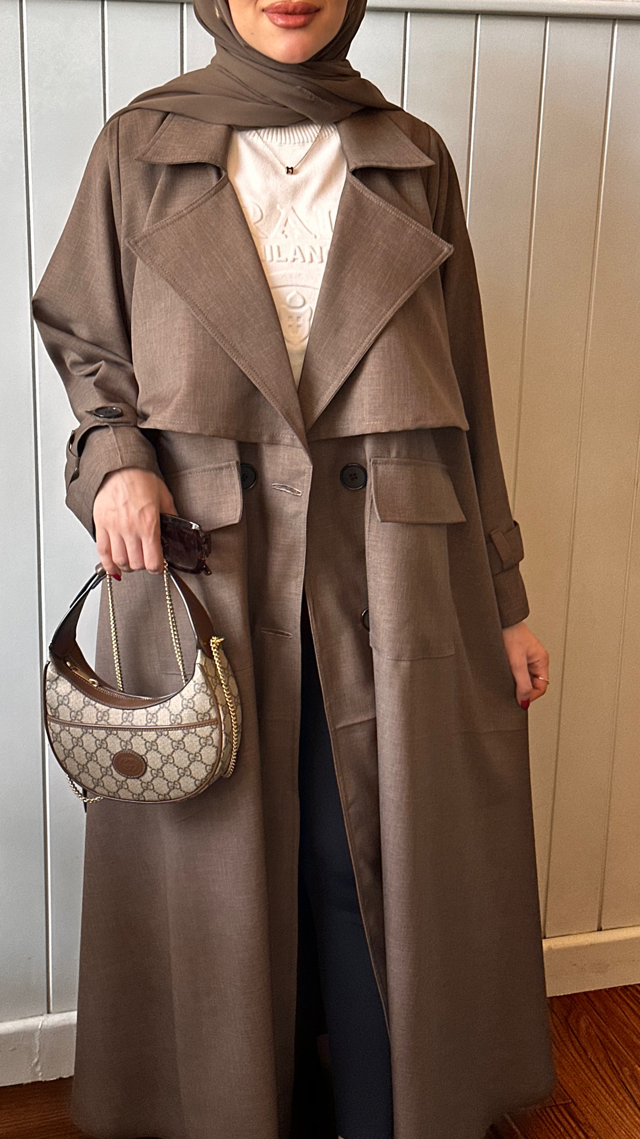 AN ELEGANT  ABAYA IN TRENCH COAT DESIGN AND  QUILTY  MATRIAL WITH TOUCH OF BATTON  AND BELT TO BE COMFORTABLE  , BE ELEGANT BE UNIQUE.
